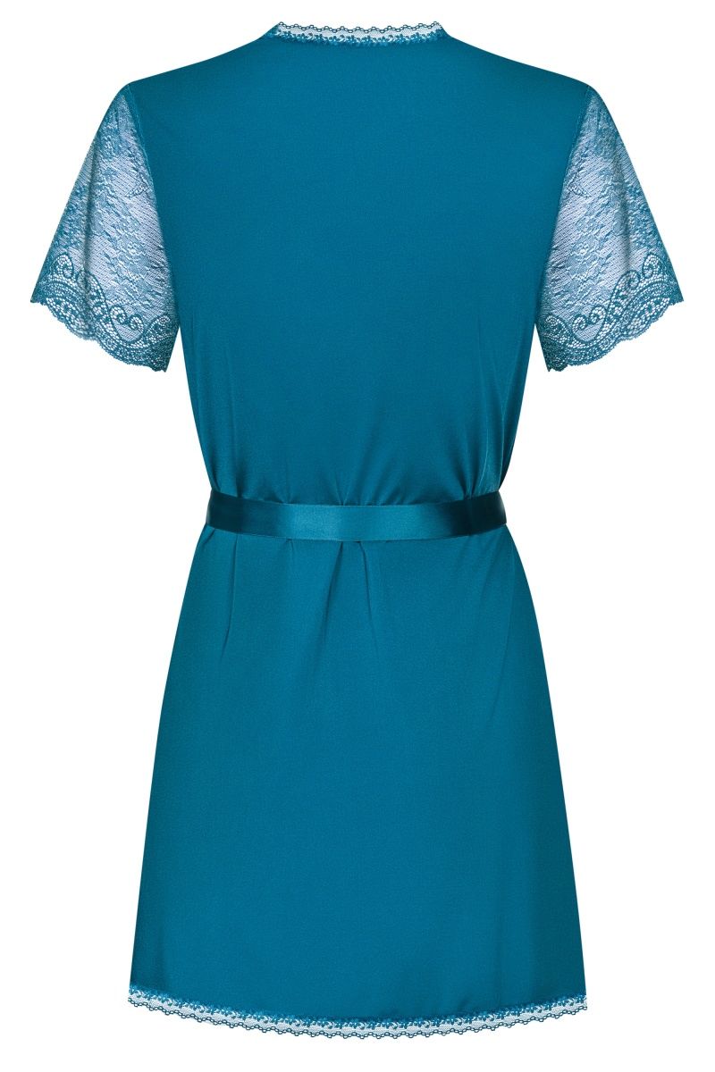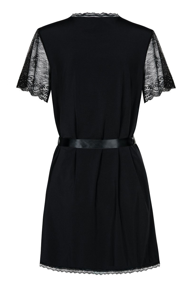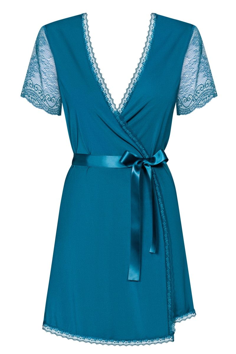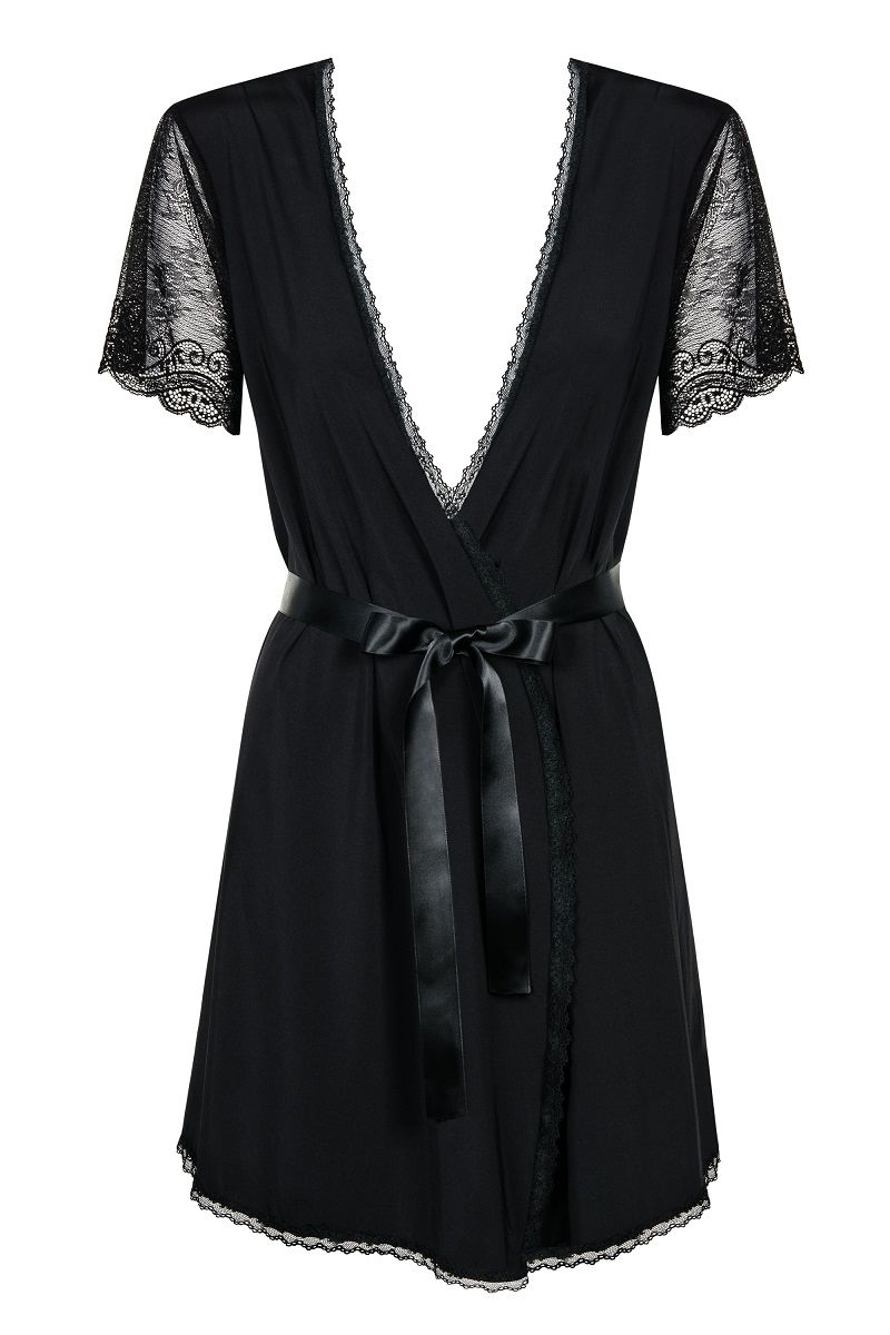 Полупрозрачный пеньюар с кружевными рукавчиками. Завязывается на атласный поясок. В комплекте: пеньюар, трусики-стринги.
