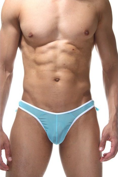 Голубые трусы-тонги из полупрозрачной тонкой сетчатой ткани, с белым кантом. Сзади бахрома, окаймляющая ягодицы.