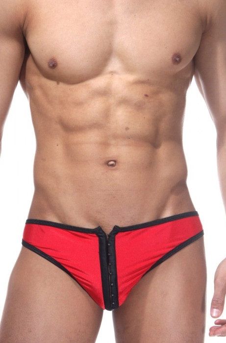 Трусы-тонги, которые застегиваются на застежку спереди. Гладкая ткань, окантованная контрастным материалом.