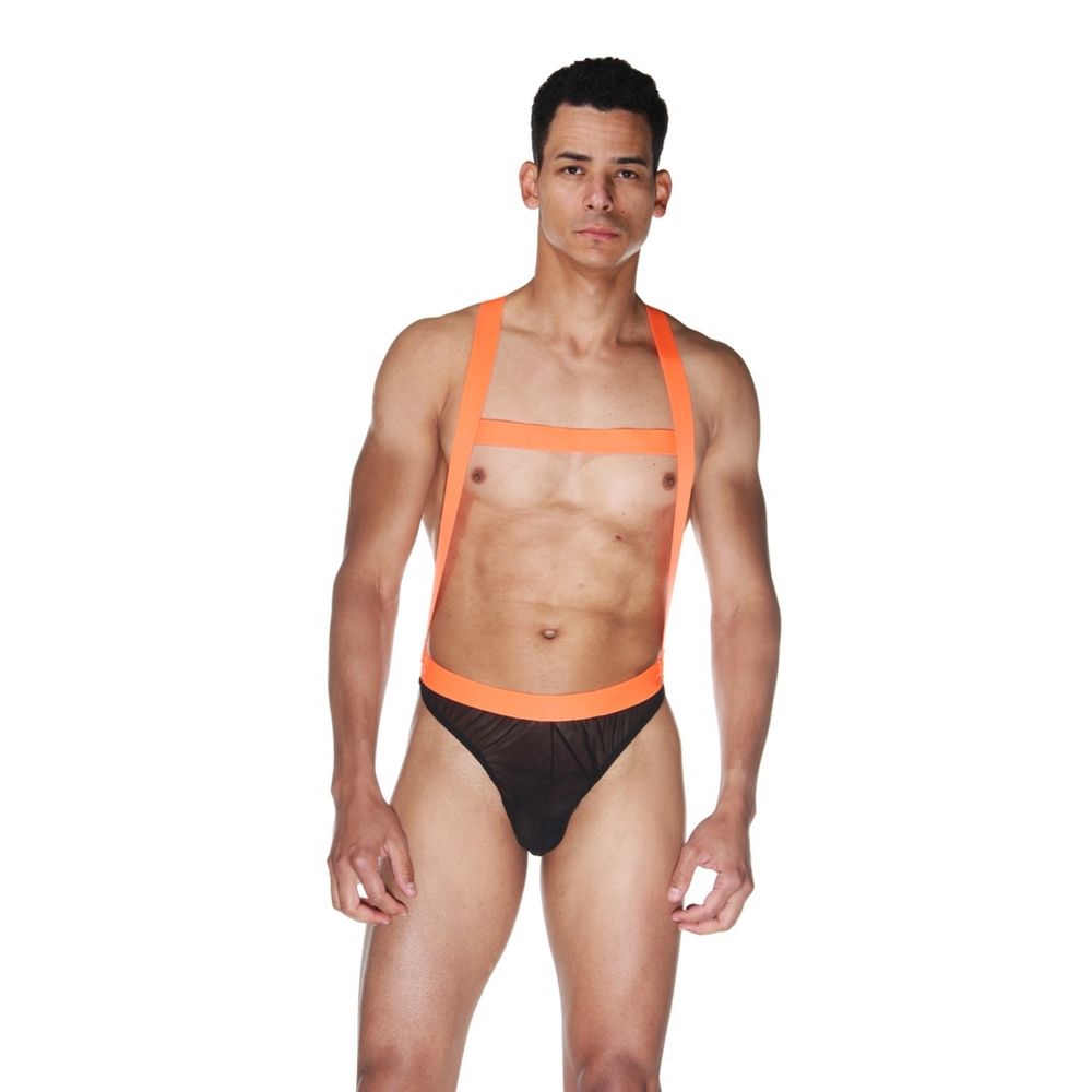 Слипы-боди для мужчин из черного полупрозрачного тонкого материала. Пояс и ремни оранжевого цвета.