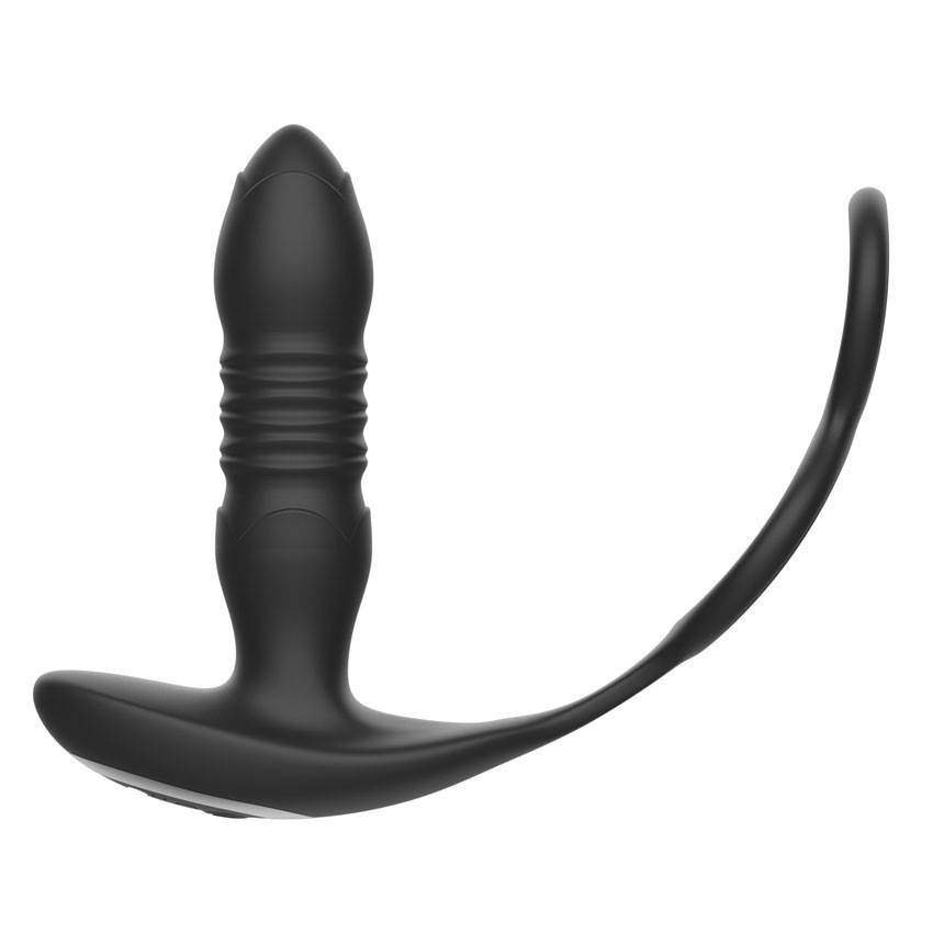 Черный анальный вибромассажёр с возвратно-поступательными движениями и кольцами для фиксации. 10 режимов возвратно-поступательных движений. Пульт дистанционного управления. Рабочая длина - 11,3 см. Диаметр колец - 4,1 и 3,2 см.