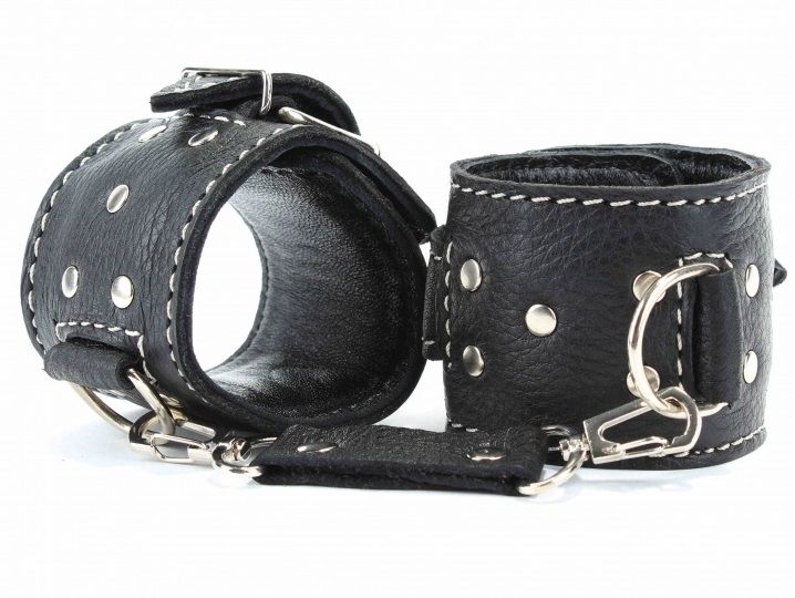 Чёрные кожаные наручники с крупной строчкой.