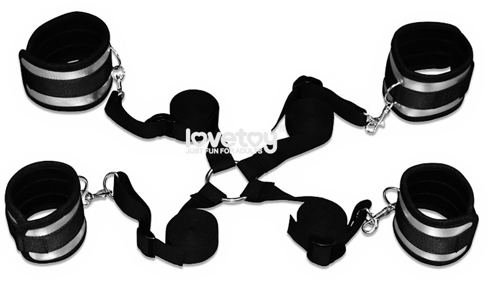 Набор для фиксации. Прочные и надежные наручники с зажимами и ремешками на липучках крепятся карабинами к широкой ленте. Внутри наручников мягкая бархатная подкладка с атласной поверхностью. Длина лент - 161 см., ширина - 2,5 см. Длина наручников - 23 см., ширина - 7 см.