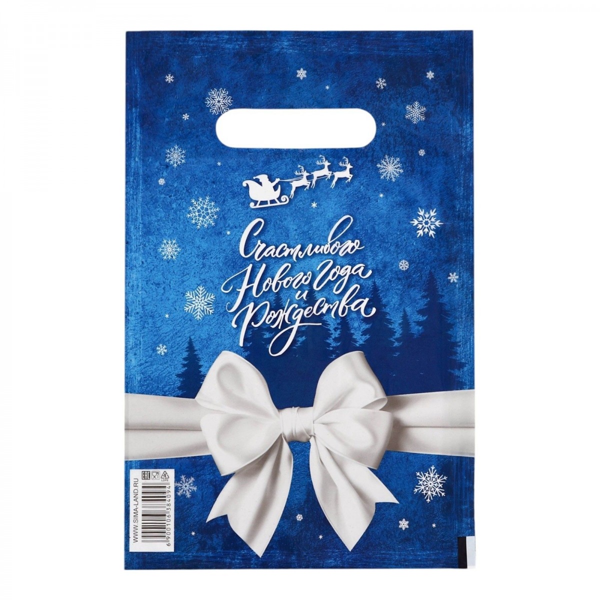 Сине-белый подарочный новогодний пакет с вырубной ручкой (20х30 см).