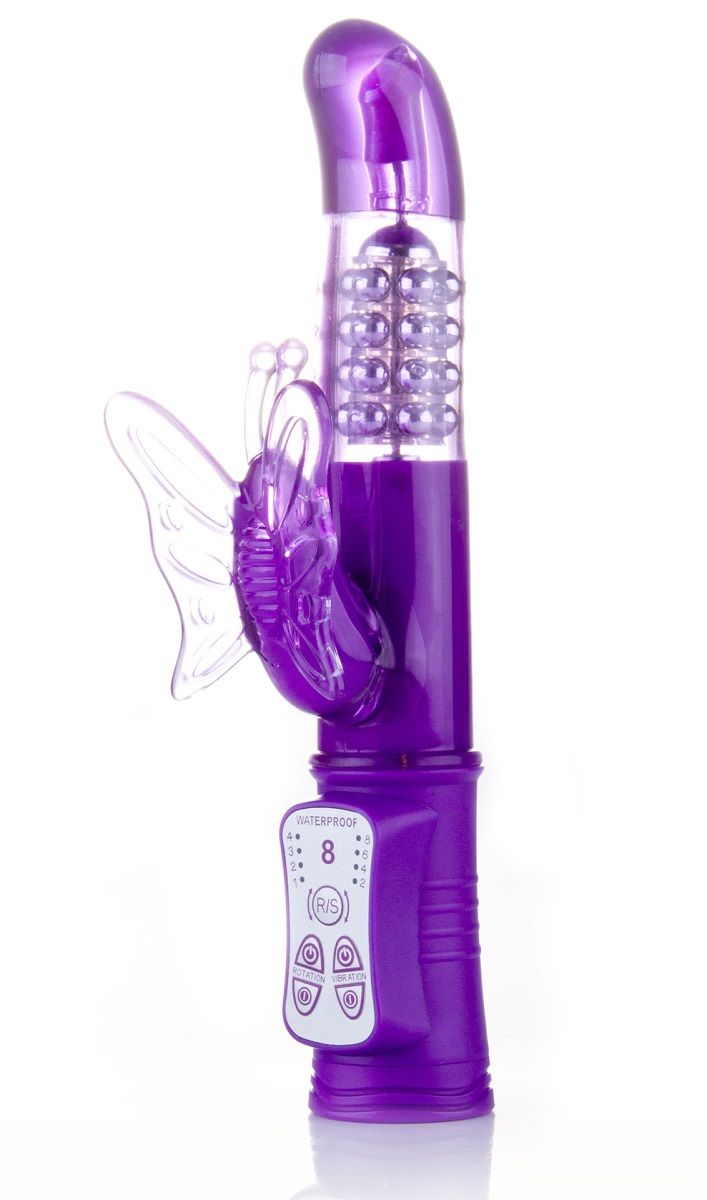 Вибромассажер с функцией вращения ствола и мощным клиторальным стимулятором в виде бабочки. Имеет 8 режимов (ротация и вибрация). Данные режимы можно совмещать . Управляется кнопками в основании игрушки. Мягкий, имеет не пористую структуру . Батарейки в комплекте. Рабочая длина - 12 см.