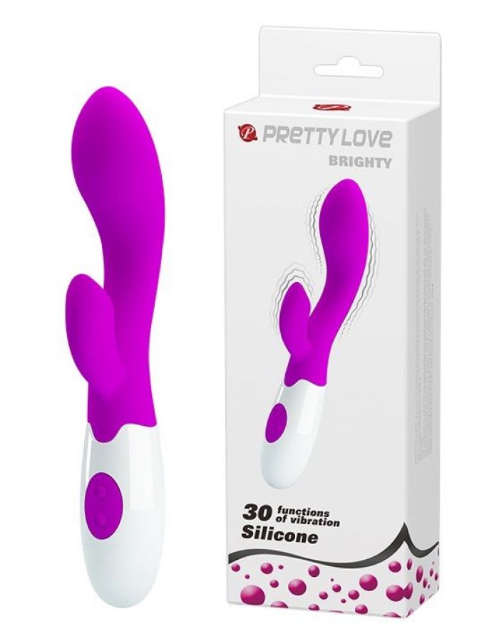 Силиконовый Brighty от Baile с изогнутой головкой для интенсивной стимуляции точки G и дальних уголков вагины. Вибрации, производимые двумя моторами, распространяются по всему стволу и клиторальному стимулятору. Удобные кнопки переключения. 30 функций вибрации на выбор. Рабочая длина - 10,2 см. Длина клиторального отростка - 4,8 см., диаметр - 1,8 см.